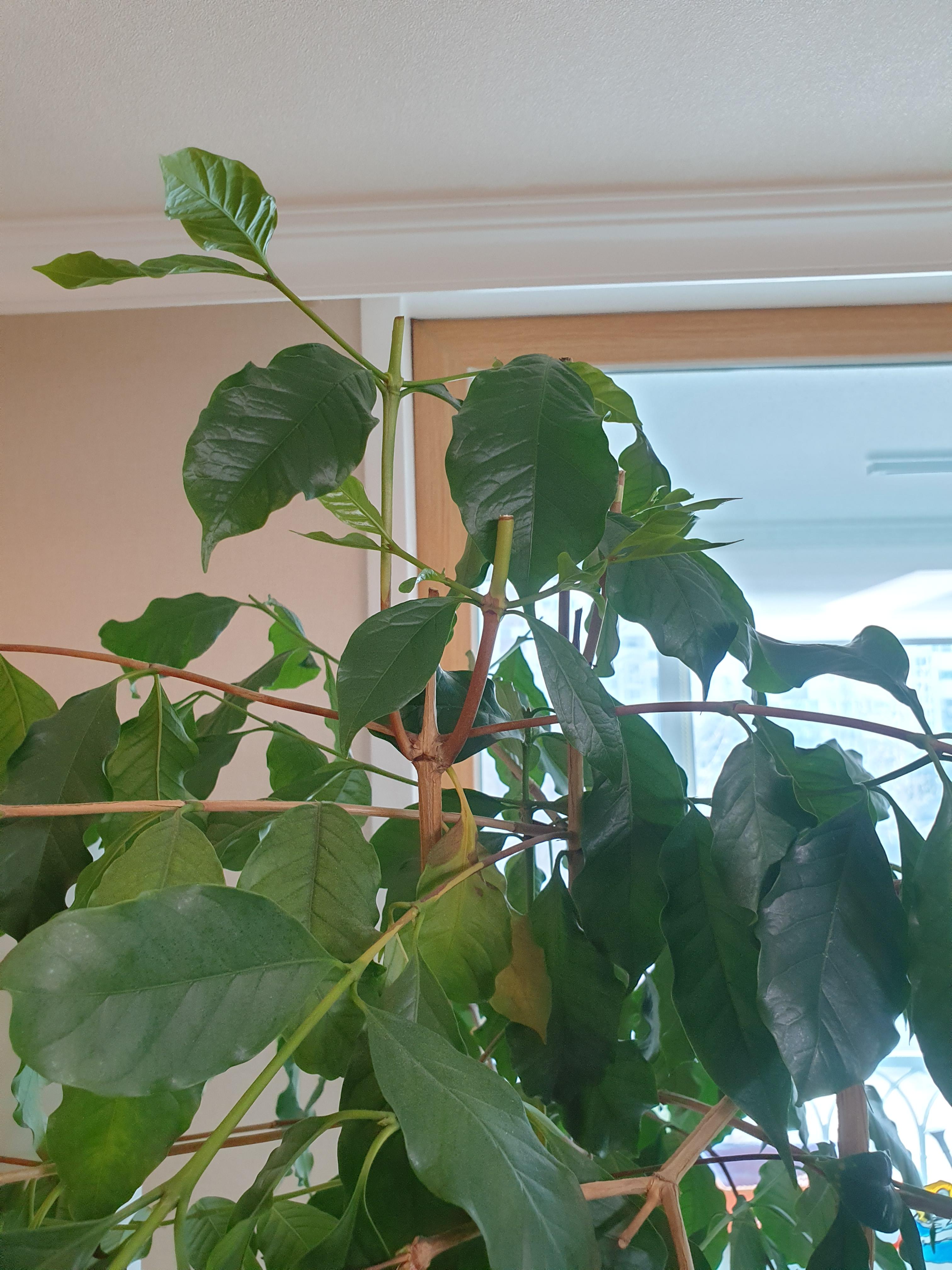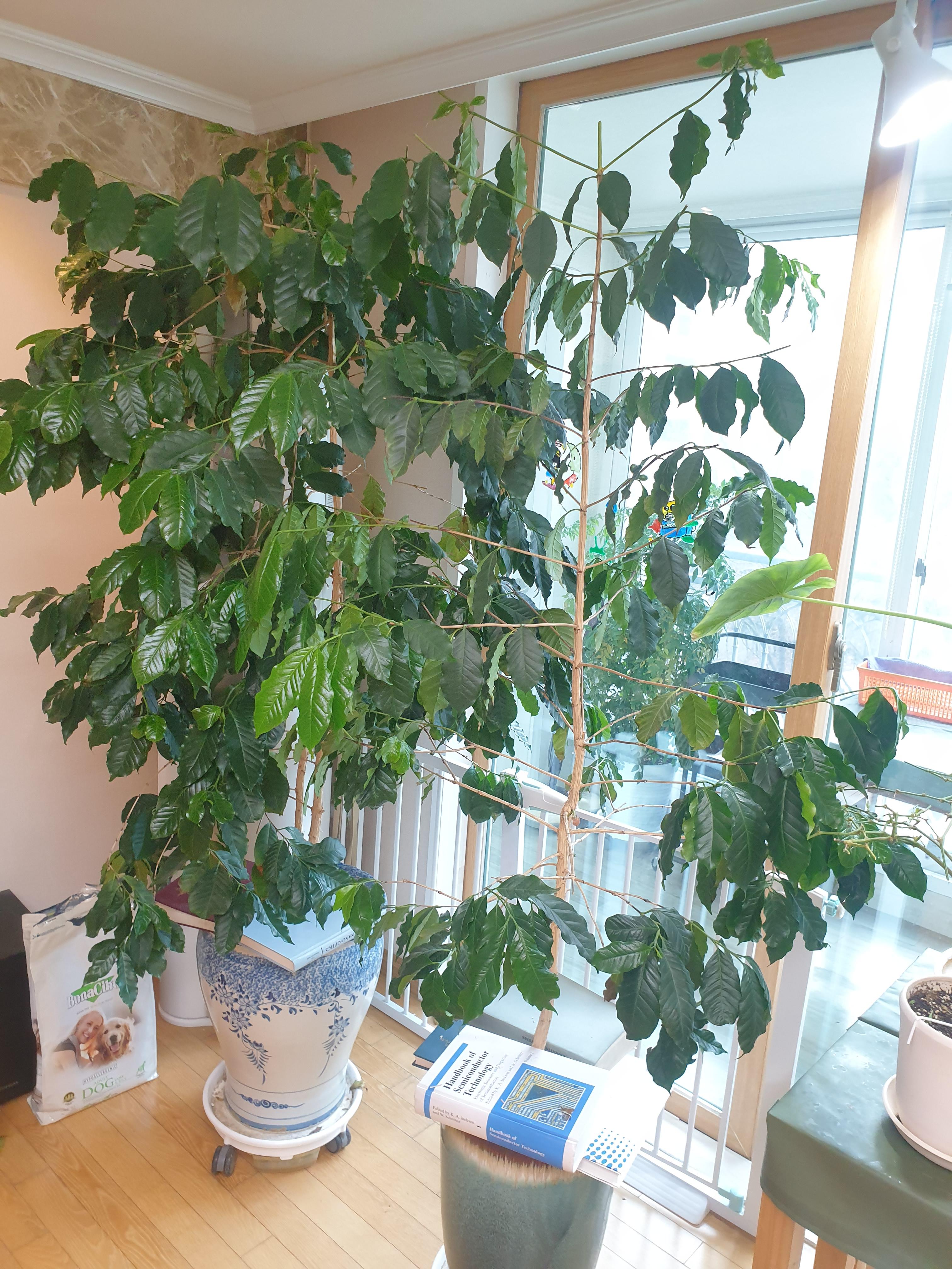 커피는 물주기만 잘 해주면 정말 잘 자라는 것 같다. 다만 겨울에는 반드시 실내에서.. 5도 이하에서는 잎이 냉해를 입어 갈색으로 변하며 떨어진다. 집에서 키우기에는 커다란 나무가 되었지만 따뜻한 곳에서는 사시사철 푸르다.