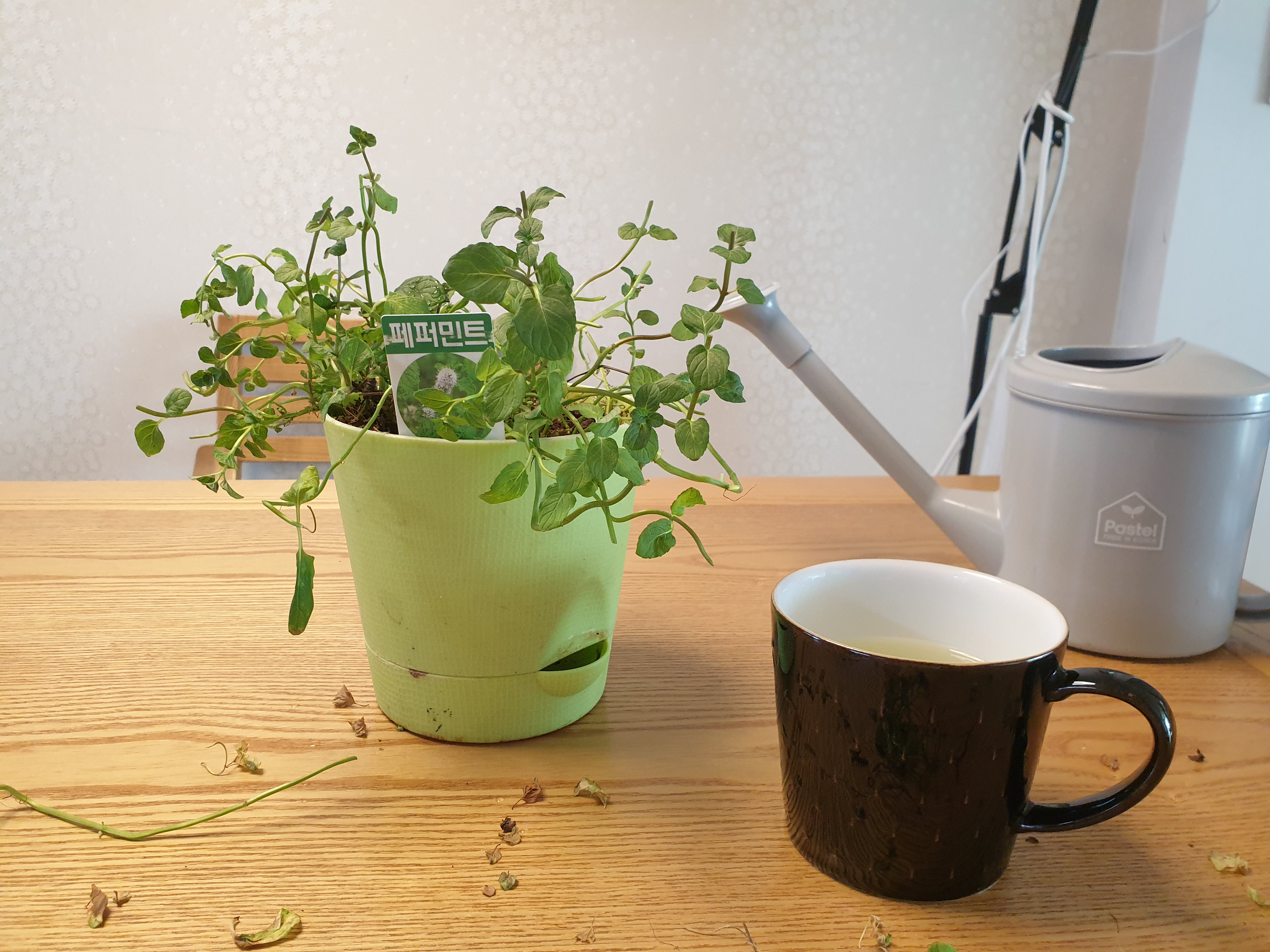 페퍼민트차. 맛은 있다. 하.. 그런데 롯*껌을 씻은 물 맛이 난다. 조금은 오묘한 맛이다. 생잎을 우려내서 그런가 보다. 잎을 약북에 덖은 후에 우려냈어야 했나...