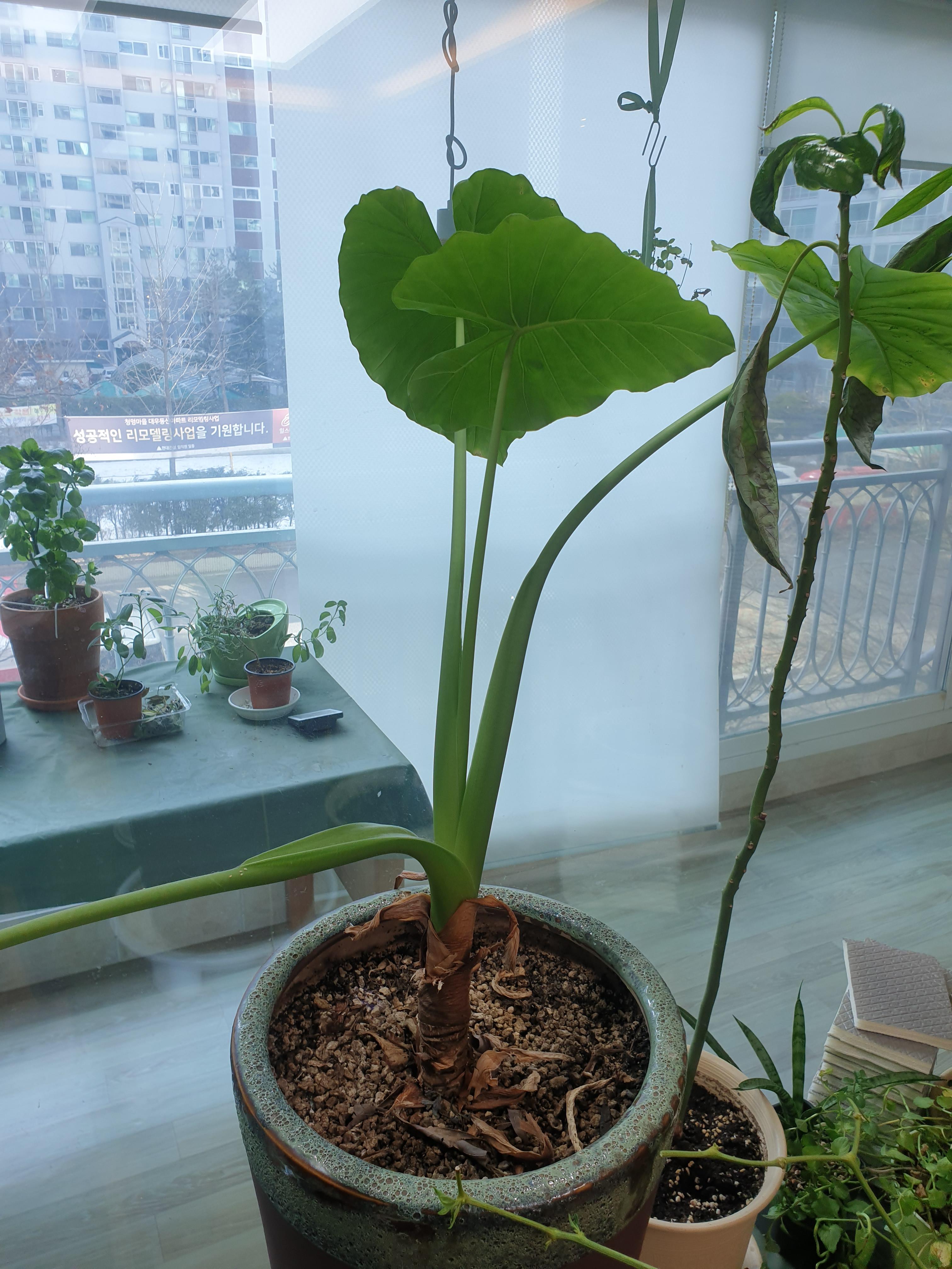 거실 어두운 곳에서 마지막으로 난 작은 잎 이후로 성장을 멈추었다. 잎은 모두 창을 바라보며 너무 어둡다고 불 키라고 시위중이다. 절대적으로 빛이 많이 필요한 식물. 그렇다고 직광은 좋지 않다.