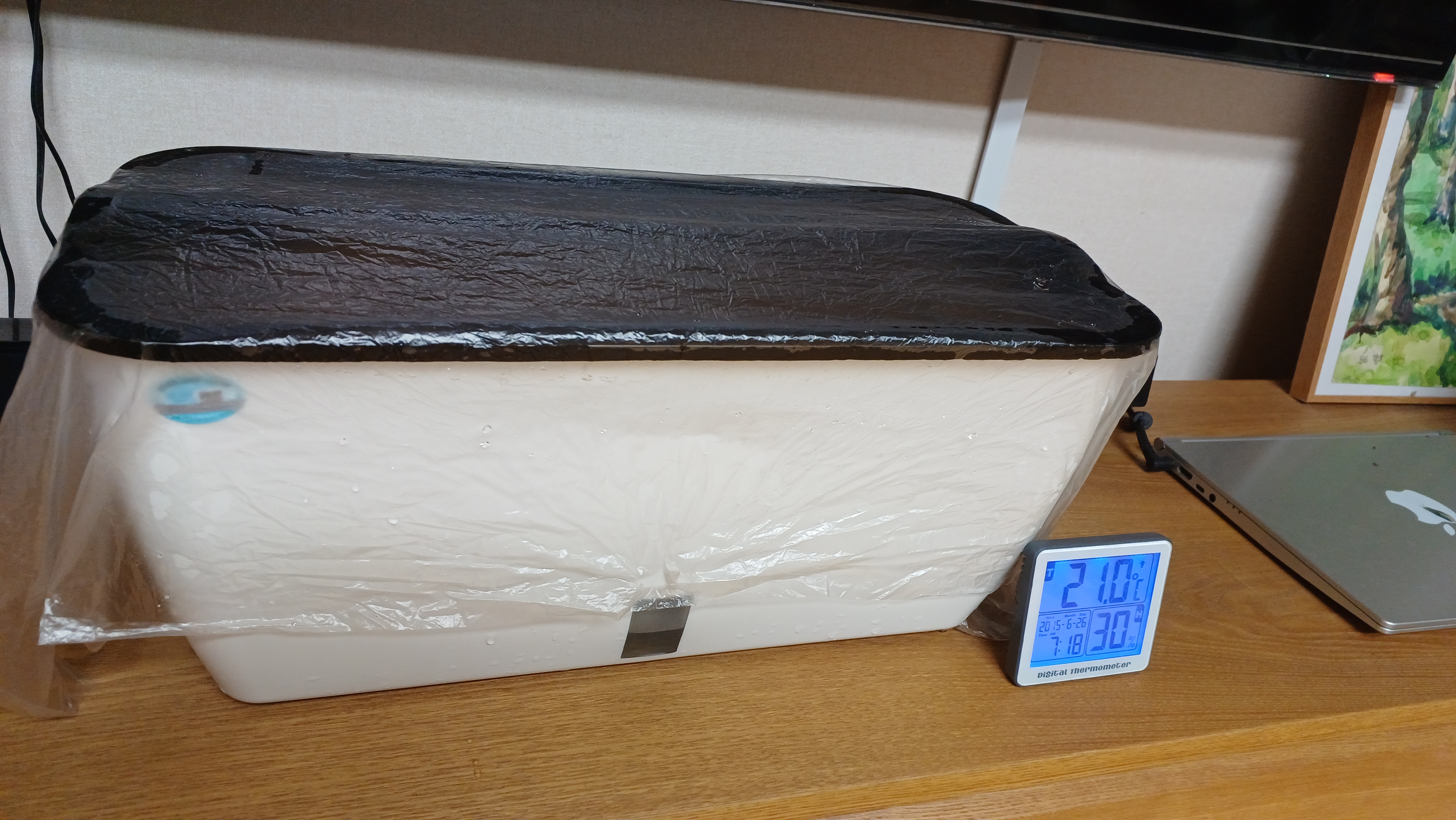 화분을 비닐로 덮어 실내에 둔다. 실내 습도가 매우 낮기 때문에 반드시 덮어 밝은 곳에 둔다. 건조하면 흙이 마르기 때문에 발아가 되지 않을 가능성이 있다. 또 바질은 빛이 있어야 발아가 되는 광발아 종자이기 때문에 밝은 곳에 두어야 한다. 그러나 거실에 둘 수 밖에 없다. 이건 운명에 맡긴다.